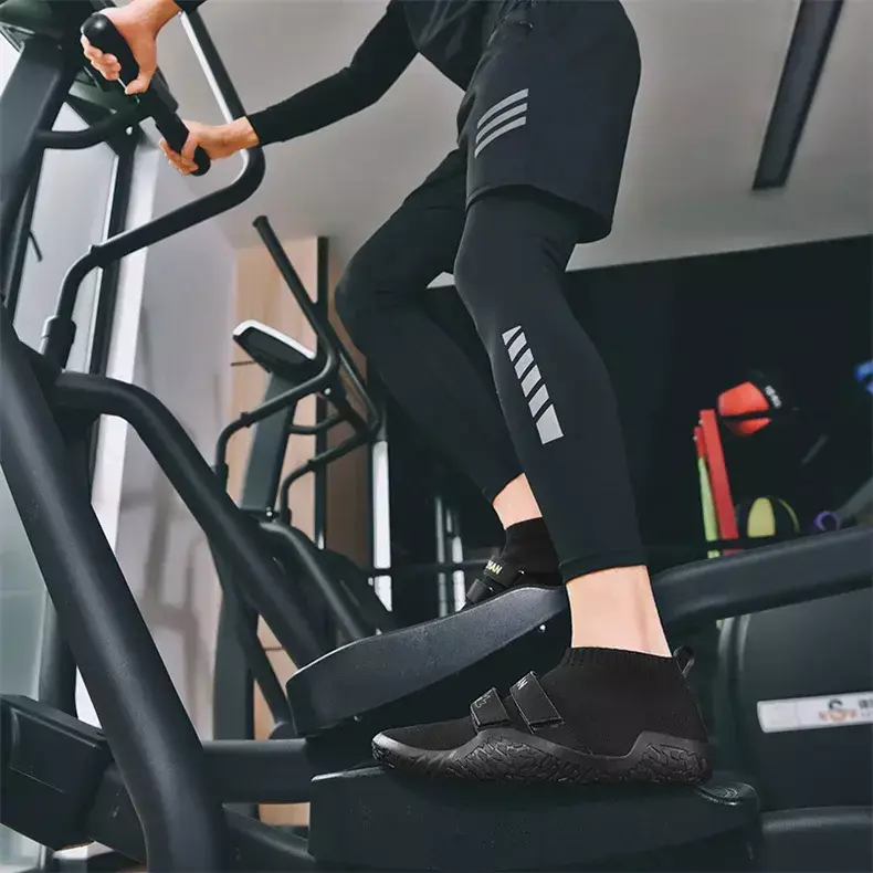 As solas são feitas de material de borracha e têm texturas tridimensionais antiderrapantes na parte inferior, o que pode efetivamente fortalecer a aderência e reduzir o impacto causado pelo exercício.